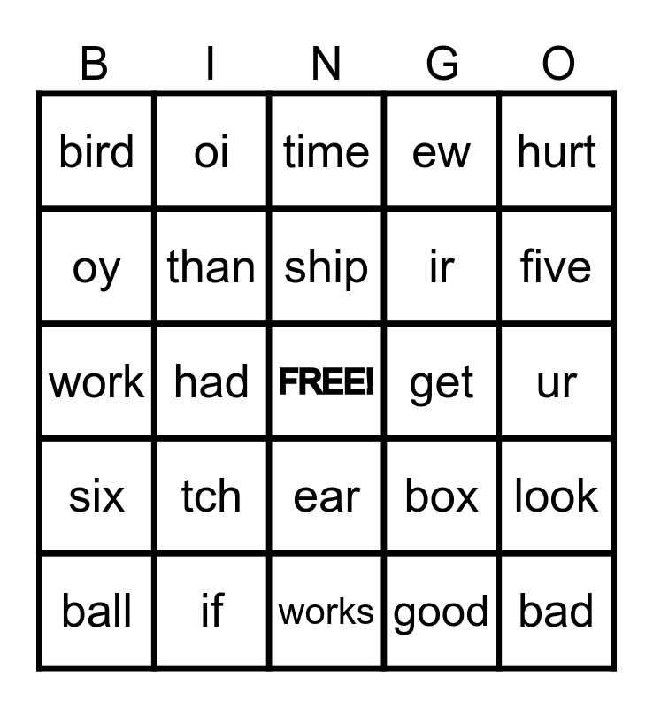 This bingo card has a free space and 29 words: out, if, time, just, hurt, bird, than, ship, get, look, ball, had, good, bad, work, patch, works, box, five, six, tch, wor, ir, ur, oy, oi, ear, ew and eu.