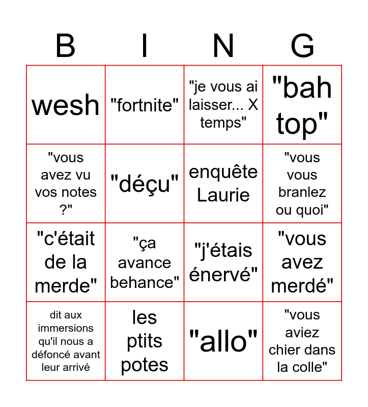 This bingo card has 16 words: les ptits potes, "vous avez merdé", "je vous ai laisser... X temps", wesh, "c'était de la merde", "fortnite", "j'étais énervé", "allo", "vous avez vu vos notes ?", "déçu", dit aux immersions qu'il nous a défoncé avant leur arrivé, "bah top", "ça avance behance", "vous vous branlez ou quoi", enquête Laurie and "vous aviez chier dans la colle".