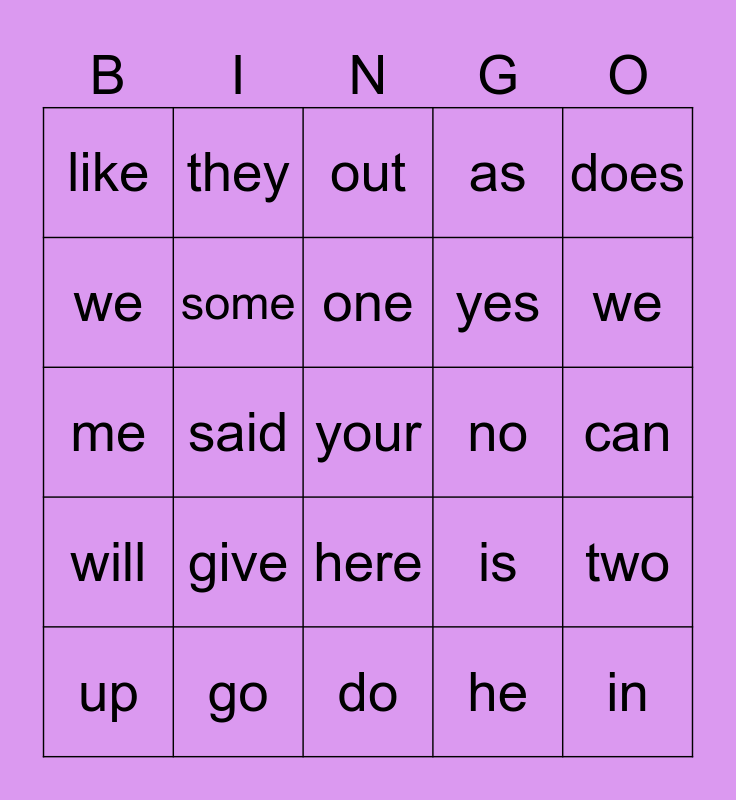 This bingo card has a free space and 54 words: the, will, was, are, here, see, as, all, we, love, like, to, go, up, my, do, in, yes, from, can, is, put, no, does, have, they, come, look, that, he, she, what, little, did, out, who, me, two, by, some, play, it, run, with, give, live, there, were, one, said, we, want, had and and.
