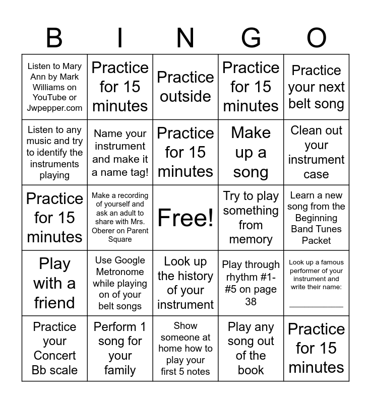This bingo card has a free space and 24 words: Practice your Concert Bb scale, Use Google Metronome while playing on of your belt songs, Practice for 15 minutes, Play any song out of the book, Practice your next belt song, Listen to Mary Ann by Mark Williams on YouTube or Jwpepper.com, Practice for 15 minutes, Practice outside, Try to play something from memory, Learn a new song from the Beginning Band Tunes Packet, Practice for 15 minutes, Name your instrument and make it a name tag!, Play through rhythm #1-#5 on page 38, Look up a famous performer of your instrument and write their name: ______________, Listen to any music and try to identify the instruments playing, Perform 1 song for your family, Show someone at home how to play your first 5 notes, Practice for 15 minutes, Clean out your instrument case, Play with a friend, Make a recording of yourself and ask an adult to share with Mrs. Oberer on Parent Square, Look up the history of your instrument, Make up a song and Practice for 15 minutes.