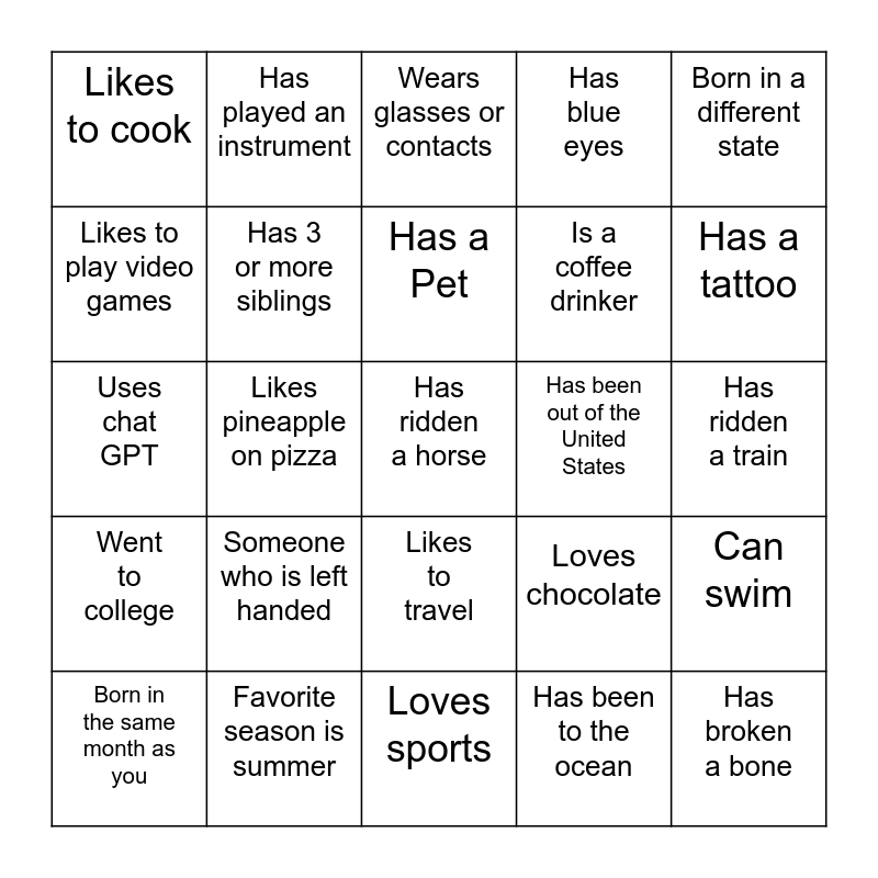This bingo card has 25 words: Someone who is left handed, Loves sports, Has a Pet, Born in the same month as you, Born in a different state, Likes to cook, Likes to play video games, Has played an instrument, Has been out of the United States, Likes to travel, Is a coffee drinker, Uses chat GPT, Loves chocolate, Can swim, Has 3 or more siblings, Has broken a bone, Has ridden a train, Wears glasses or contacts, Has a tattoo, Likes pineapple on pizza, Has ridden a horse, Favorite season is summer, Went to college, Has blue eyes and Has been to the ocean.