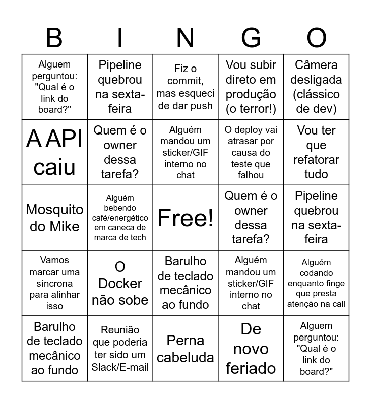 This bingo card has a free space and 69 words: "Na minha máquina funciona", Pipeline quebrou na sexta-feira, Alguém esqueceu o microfone aberto no Daily, Isso é bug ou é feature?, Reunião que poderia ter sido um Slack/E-mail, Alguém com o fundo desfocado mostrando o pet, Vou subir direto em produção (o terror!), Alguém mencionou o termo "Legado", Câmera desligada (clássico de dev), A API caiu, Alguém codando enquanto finge que presta atenção na call, O Docker não sobe, Alguem perguntou: "Qual é o link do board?", Fiz o commit, mas esqueci de dar push, Discussão sobre qual IDE é melhor (VS Code vs IntelliJ), Alguém bebendo café/energético em caneca de marca de tech, Barulho de teclado mecânico ao fundo, O deploy vai atrasar por causa do teste que falhou, Alguém usando camiseta de evento de tecnologia, Vamos marcar uma síncrona para alinhar isso, Quem é o owner dessa tarefa?, Alguém mandou um sticker/GIF interno no chat, Vou ter que refatorar tudo, Bilola de Brenan, Perna cabeluda, Estourado, O Ducz caiu, Chegou o disco voador, De novo feriado, "Na minha máquina funciona", Pipeline quebrou na sexta-feira, Alguém esqueceu o microfone aberto no Daily, Isso é bug ou é feature?, Reunião que poderia ter sido um Slack/E-mail, Alguém com o fundo desfocado mostrando o pet, Vou subir direto em produção (o terror!), Alguém mencionou o termo "Legado", Câmera desligada (clássico de dev), A API caiu, Alguém codando enquanto finge que presta atenção na call, O Docker não sobe, Alguem perguntou: "Qual é o link do board?", Fiz o commit, mas esqueci de dar push, Discussão sobre qual IDE é melhor (VS Code vs IntelliJ), Alguém bebendo café/energético em caneca de marca de tech, Barulho de teclado mecânico ao fundo, O deploy vai atrasar por causa do teste que falhou, Alguém usando camiseta de evento de tecnologia, Vamos marcar uma síncrona para alinhar isso, Quem é o owner dessa tarefa?, Alguém mandou um sticker/GIF interno no chat, Vou ter que refatorar tudo, Bilola de Brenan, Perna cabeluda, Estourado, O Ducz caiu, Chegou o disco voador, De novo feriado, Cruzinho, Mosquito do Mike, Sinal de fumaça, Já avisou do grupo da sede?, Priscila rica, Esposa compartilhada, Rebolar, Dev ou Front, Mike barraqueiro, Ja provou Kenga? and Pernonas é um elogio?.
