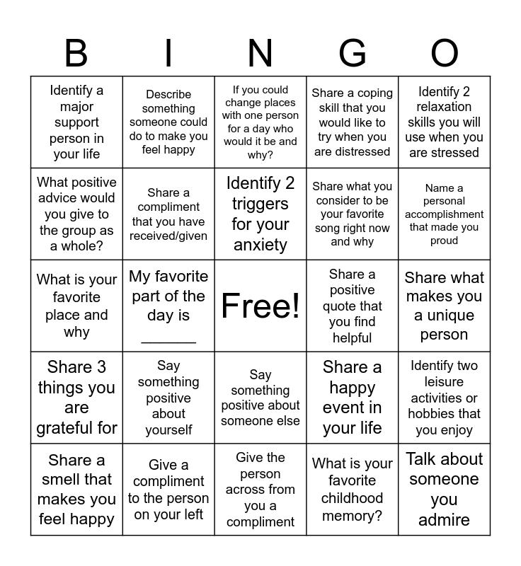 This bingo card has a free space and 24 words: Say something positive about yourself, Give a compliment to the person on your left, Identify 2 triggers for your anxiety, Share a smell that makes you feel happy, Identify 2 relaxation skills you will use when you are stressed, Identify a major support person in your life, What positive advice would you give to the group as a whole?, Describe something someone could do to make you feel happy, Share a positive quote that you find helpful, Say something positive about someone else, Share what you consider to be your favorite song right now and why, What is your favorite place and why, Share a happy event in your life, Identify two leisure activities or hobbies that you enjoy, Share a compliment that you have received/given, What is your favorite childhood memory?, Share what makes you a unique person, If you could change places with one person for a day who would it be and why?, Name a personal accomplishment that made you proud, My favorite part of the day is ______, Talk about someone you admire, Share 3 things you are grateful for, Share a coping skill that you would like to try when you are distressed and Give the person across from you a compliment.