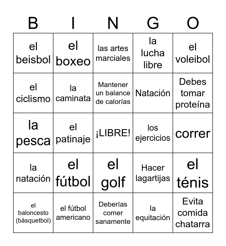 This bingo card has a free space and 24 words: el fútbol, el fútbol americano, Mantener un balance de calorías, el baloncesto (básquetbol), el voleibol, el beisbol, el ciclismo, el boxeo, los ejercicios, el golf, Natación, la pesca, Hacer lagartijas, el ténis, la caminata, la equitación, correr, las artes marciales, Debes tomar proteína, el patinaje, Evita comida chatarra, la natación, la lucha libre and Deberías comer sanamente.