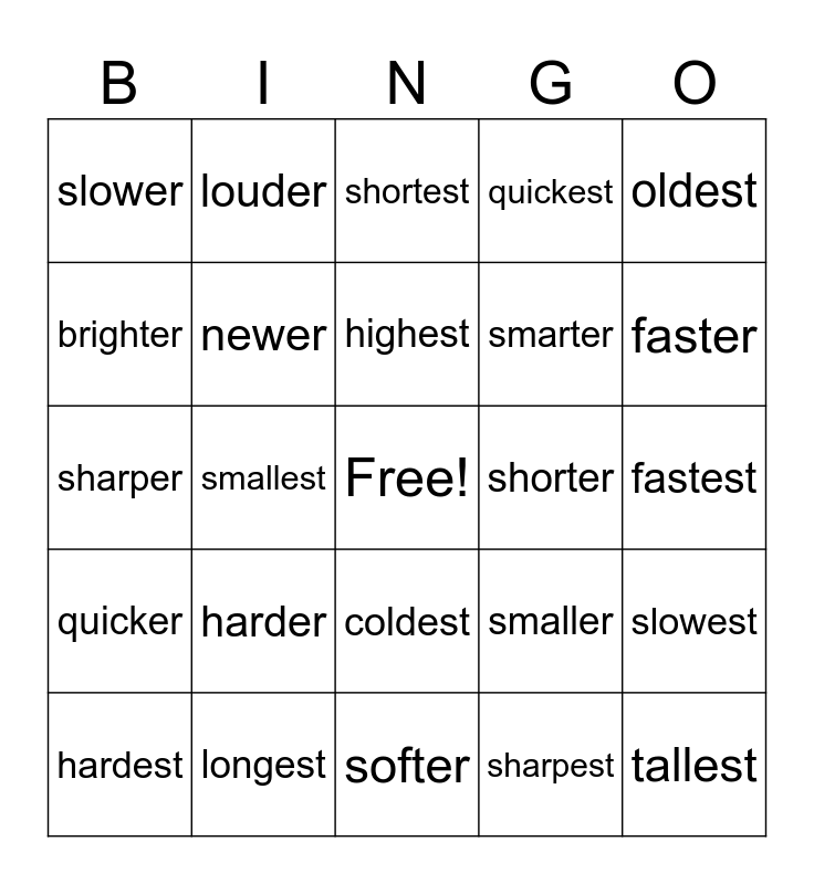 This bingo card has a free space and 36 words: higher, lower, older, newer, smaller, quicker, highest, lowest, oldest, newest, smallest, quickest, taller, shorter, faster, slower, longer, harder, tallest, shortest, fastest, slowest, longest, hardest, softer, louder, sharper, colder, smarter, brighter, softest, loudest, sharpest, coldest, smartest and brightest.