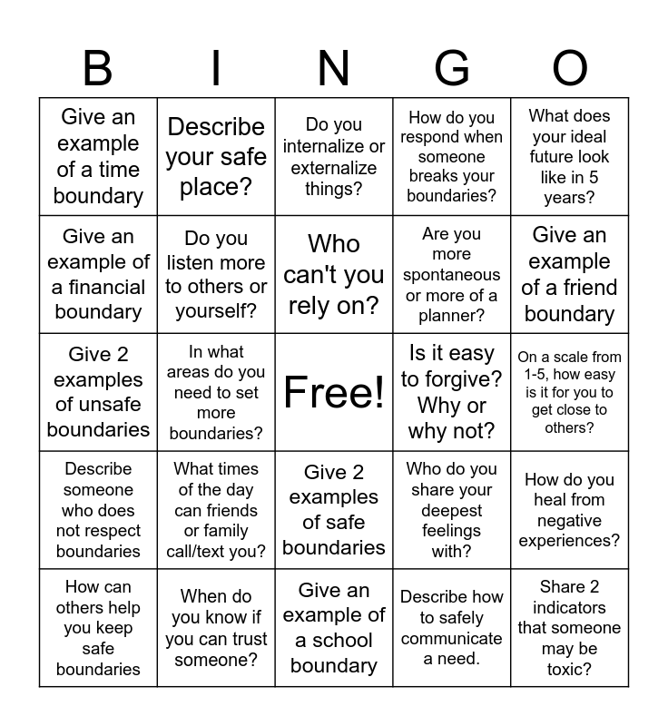 This bingo card has a free space and 32 words: Describe how to safely communicate a need., How can you show yourself love?, In what areas do you need to set more boundaries?, What is one activity that relaxes you?, Describe someone who does not respect boundaries, Do you listen more to others or yourself?, What does your ideal future look like in 5 years?, How do you heal from negative experiences?, Describe your safe place?, Who can you count on?, Who can't you rely on?, Do you internalize or externalize things?, How can you communicate better?, Who is someone that you would like to have a stronger connection with?, Is it easy to forgive? Why or why not?, Are you comfortable setting limits? (Ex: "No" or "Stop") Why or why not?, How can others help you keep safe boundaries, Give 2 examples of unsafe boundaries, Give 2 examples of safe boundaries, What times of the day can friends or family call/text you?, Who do you share your deepest feelings with?, What situations drain your emotions?, On a scale from 1-5, how easy is it for you to get close to others?, When do you know if you can trust someone?, Share 2 indicators that someone may be toxic?, How do you respond when someone breaks your boundaries?, Are you more spontaneous or more of a planner?, Give an example of a financial boundary, Give an example of a time boundary, Give an example of a school boundary, Give an example of a family boundary and Give an example of a friend boundary.