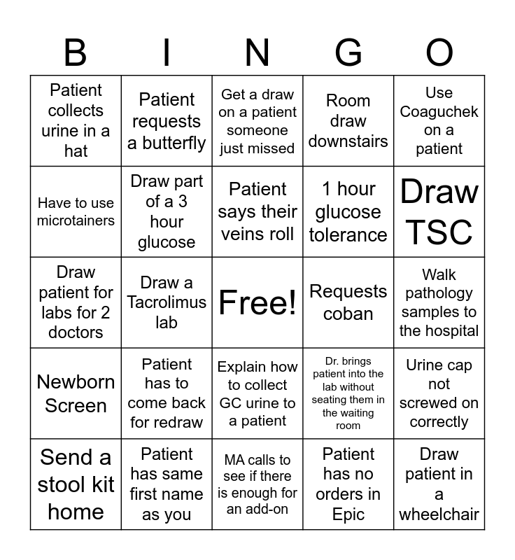 This bingo card has a free space and 34 words: 24 - hour urine drop off, Patient has no orders in Epic, Specimen drop off, Draw a 1 year old, Newborn Screen, Draw part of a 3 hour glucose, Use Coaguchek on a patient, Send a stool kit home, Patient requests a butterfly, Draw from a hand vein, Patient says their veins roll, Get a draw on a patient someone just missed, After-visit with a urine only, Patient asks "is coffee ok" when asked if fasting, Requests coban, Draw TSC, Patient has same first name as you, Draw patient for labs for 2 doctors, Patient has to come back for redraw, Dr. brings patient into the lab without seating them in the waiting room, Explain how to collect GC urine to a patient, Give stickers to a kid, Patient collects urine in a hat, Walk pathology samples to the hospital, MA calls to see if there is enough for an add-on, Draw patient in a wheelchair, Room draw downstairs, Glucose monitor check, 1 hour glucose tolerance, Have to use microtainers, Patient only has A1C ordered, Draw a Tacrolimus lab, Urine cap not screwed on correctly and Use the reference lab manual to look up a test.