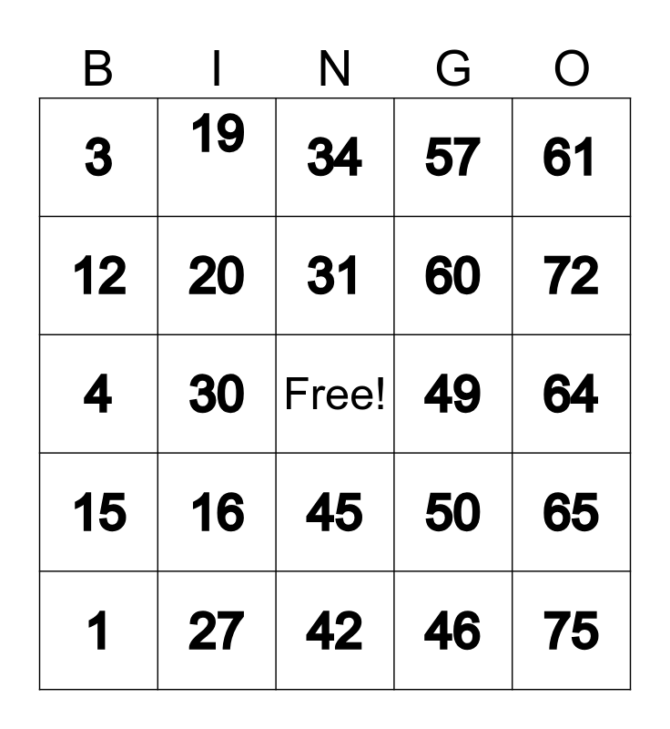 This bingo card has a free space and 24 words: 1, 16, 31, 46, 61, 3, 19, 34, 49, 64, 4, 20, 50, 65, 12, 27, 42, 57, 72, 15, 30, 45, 60 and 75.