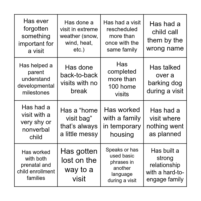 This bingo card has 36 words: Has been a home visitor for less than 6 months, Has conducted a visit in a non-traditional setting (park, library, etc.), Has worked with a family for over a year, Has completed more than 100 home visits, Previously worked in a different field before home visiting, Has built a strong relationship with a hard-to-engage family, Has talked over a barking dog during a visit, Has been offered food during a visit, Has helped a parent understand developmental milestones, Has gotten a child to laugh who was upset, Has had a visit where nothing went as planned, Has had a child call them by the wrong name, Has a go-to activity that always works, Has gotten lost on the way to a visit, Has a “home visit bag” that’s always a little messy, Has ever forgotten something important for a visit, Has been a home visitor for 5+ years, Has worked in both center-based and home-based programs, Has worked with both prenatal and child enrollment families, Has had a visit rescheduled more than once with the same family, Speaks or has used basic phrases in another language during a visit, Has worked with a teen parent, Has supported a family through a move, Has had a visit with more than 3 children present, Has traveled more than 30 minutes for a single visit, Has done a visit in extreme weather (snow, wind, heat, etc.), Has worked with a family in temporary housing, Has worked with a family for less than 3 months total, Has had a visit with a very shy or nonverbal child, Has done back-to-back visits with no break, Has had to problem-solve a safety concern during a visit, Has done a visit in a setting with no toys available, Has had a visit interrupted by an unexpected emergency, Has had a visit with extended family members present, Has used a translation app during a visit and Has collaborated on an IEP or IFSP meeting.