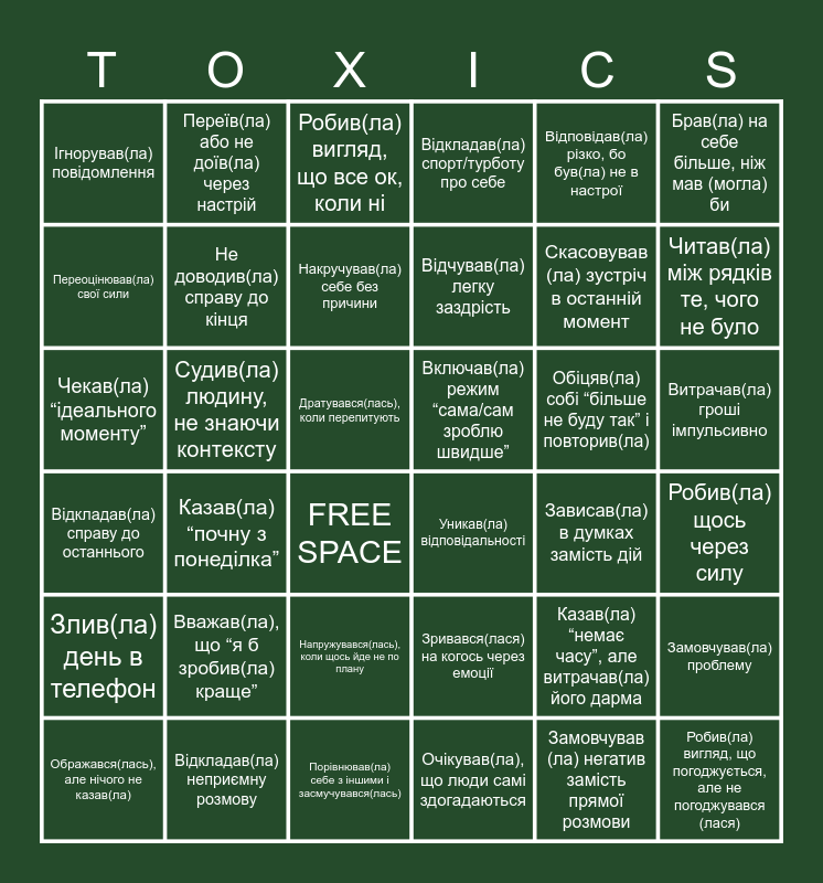 This bingo card has 36 words: Відкладав(ла) справу до останнього, Казав(ла) “почну з понеділка”, Порівнював(ла) себе з іншими і засмучувався(лась), Відчував(ла) легку заздрість, Обіцяв(ла) собі “більше не буду так” і повторив(ла), Витрачав(ла) гроші імпульсивно, Ігнорував(ла) повідомлення, Відкладав(ла) неприємну розмову, Робив(ла) вигляд, що все ок, коли ні, Зривався(лася) на когось через емоції, Скасовував (ла) зустріч в останній момент, Брав(ла) на себе більше, ніж мав (могла) би, Злив(ла) день в телефон, Судив(ла) людину, не знаючи контексту, Накручував(ла) себе без причини, Відкладав(ла) спорт/турботу про себе, Казав(ла) “немає часу”, але витрачав(ла) його дарма, Робив(ла) щось через силу, Переоцінював(ла) свої сили, Не доводив(ла) справу до кінця, FREE SPACE, Уникав(ла) відповідальності, Зависав(ла) в думках замість дій, Замовчував(ла) проблему, Чекав(ла) “ідеального моменту”, Переїв(ла) або не доїв(ла) через настрій, Дратувався(лась), коли перепитують, Очікував(ла), що люди самі здогадаються, Відповідав(ла) різко, бо був(ла) не в настрої, Читав(ла) між рядків те, чого не було, Ображався(лась), але нічого не казав(ла), Вважав(ла), що “я б зробив(ла) краще”, Напружувався(лась), коли щось йде не по плану, Включав(ла) режим “сама/сам зроблю швидше”, Замовчував (ла) негатив замість прямої розмови and Робив(ла) вигляд, що погоджується, але не погоджувався (лася).