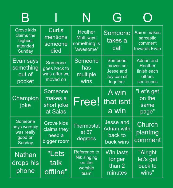 This bingo card has a free space and 24 words: Grove kids claims they need a bigger room, "Lets talk offline", Someone has multiple wins, Nathan drops his phone, Aaron makes sarcastic comment towards Evan, Grove kids claims the highest attended Sunday, Evan says something out of pocket, Curtis mentions someone died, A win that isnt a win, Thermostat at 67 degrees, Someone moves so Jesse and Joy can sit together, Champion joke, Jesse and Adrian with back to back wins, Church planting comment, Someone goes back to wins after we moved on, Win lasts longer than 2 minutes, "Let's get on the same page", Heather Moll says something is "awesome", Adrian and Heather finish each others sentences, Someone makes a short joke at Salas, "Alright let's get back to wins", Someone says worship was really good on Sunday, Someone takes a call and Reference to Nik singing on the worship team.