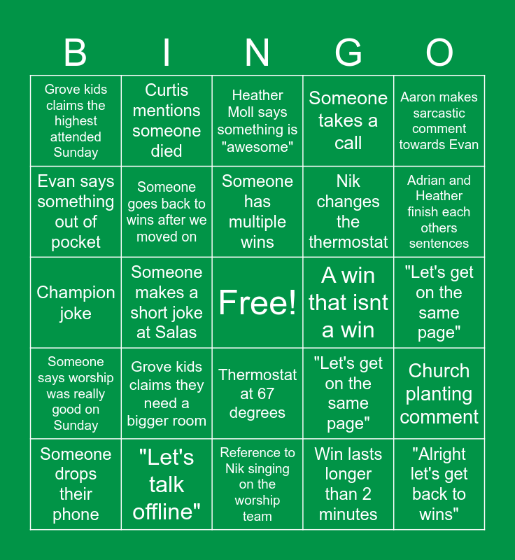 This bingo card has a free space and 24 words: Grove kids claims they need a bigger room, "Let's talk offline", Someone has multiple wins, Someone drops their phone, Aaron makes sarcastic comment towards Evan, Grove kids claims the highest attended Sunday, Evan says something out of pocket, Curtis mentions someone died, A win that isnt a win, Thermostat at 67 degrees, Nik changes the thermostat, Champion joke, "Let's get on the same page", Church planting comment, Someone goes back to wins after we moved on, Win lasts longer than 2 minutes, "Let's get on the same page", Heather Moll says something is "awesome", Adrian and Heather finish each others sentences, Someone makes a short joke at Salas, "Alright let's get back to wins", Someone says worship was really good on Sunday, Someone takes a call and Reference to Nik singing on the worship team.