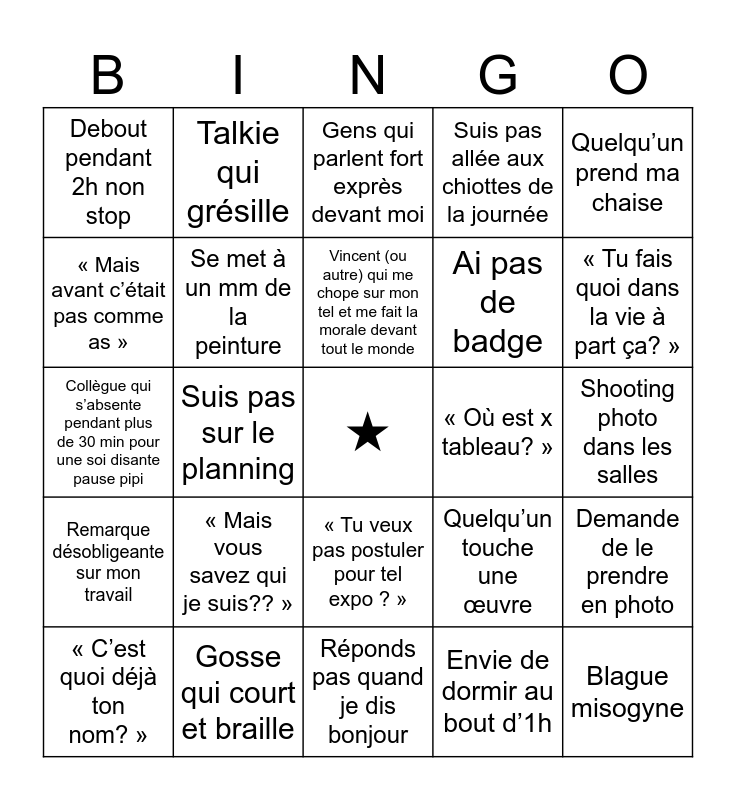 This bingo card has a free space and 24 words: « Mais vous savez qui je suis?? », Gosse qui court et braille, Vincent (ou autre) qui me chope sur mon tel et me fait la morale devant tout le monde, « C’est quoi déjà ton nom? », Quelqu’un prend ma chaise, Debout pendant 2h non stop, « Mais avant c’était pas comme as », Talkie qui grésille, « Où est x tableau? », « Tu veux pas postuler pour tel expo ? », Ai pas de badge, Collègue qui s’absente pendant plus de 30 min pour une soi disante pause pipi, Quelqu’un touche une œuvre, Demande de le prendre en photo, Se met à un mm de la peinture, Envie de dormir au bout d’1h, Shooting photo dans les salles, Gens qui parlent fort exprès devant moi, « Tu fais quoi dans la vie à part ça? », Suis pas sur le planning, Blague misogyne, Remarque désobligeante sur mon travail, Suis pas allée aux chiottes de la journée and Réponds pas quand je dis bonjour.