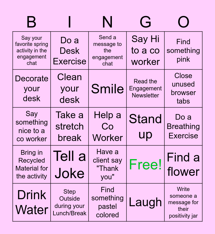 This bingo card has 25 words: Tell a Joke, Find something pastel colored, Smile, Drink Water, Find something pink, Say your favorite spring activity in the engagement chat, Decorate your desk, Do a Desk Exercise, Stand up, Have a client say "Thank you", Read the Engagement Newsletter, Say something nice to a co worker, Free!, Find a flower, Clean your desk, Write someone a message for their positivity jar, Do a Breathing Exercise, Send a message to the engagement chat, Close unused browser tabs, Take a stretch break, Help a Co Worker, Step Outside during your Lunch/Break, Bring in Recycled Material for the activity, Say Hi to a co worker and Laugh.