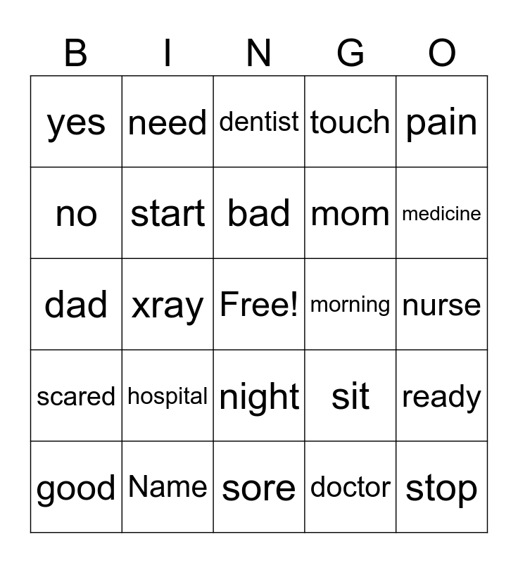 This bingo card has a free space and 24 words: hospital, Name, bad, good, pain, yes, no, need, morning, night, mom, dad, sit, ready, start, doctor, nurse, dentist, medicine, xray, stop, scared, touch and sore.