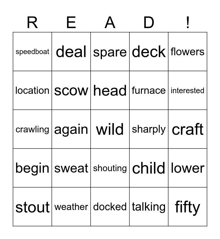 This bingo card has a free space and 24 words: sweat, weather, head, stout, flowers, speedboat, location, deal, sharply, shouting, furnace, crawling, child, lower, scow, talking, craft, spare, interested, again, fifty, begin, deck and docked.