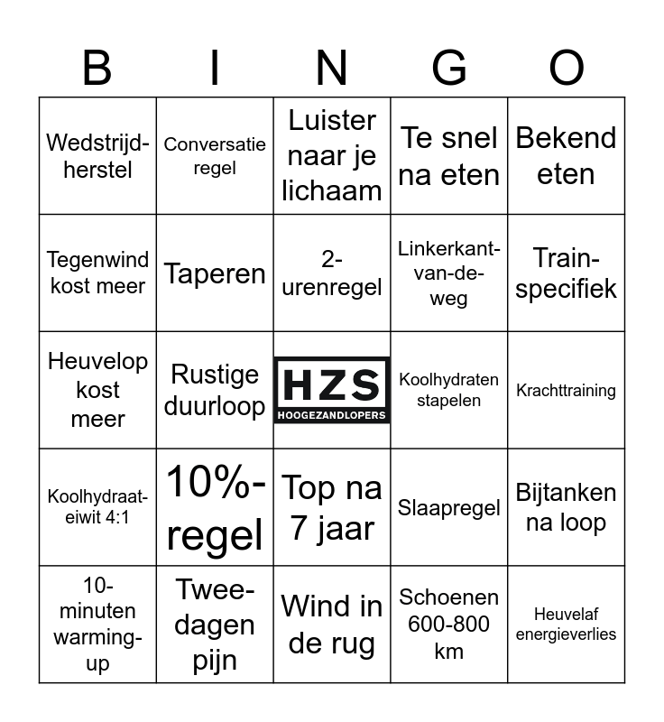 This bingo card has a free space and 24 words: 10%-regel, Twee-dagen pijn, 2-urenregel, 10-minuten warming-up, Bekend eten, Wedstrijd-herstel, Tegenwind kost meer, Conversatie regel, Koolhydraten stapelen, Top na 7 jaar, Linkerkant-van-de- weg, Heuvelop kost meer, Slaapregel, Bijtanken na loop, Taperen, Schoenen 600-800 km, Krachttraining, Luister naar je lichaam, Train-specifiek, Rustige duurloop, Heuvelaf energieverlies, Koolhydraat-eiwit 4:1, Te snel na eten and Wind in de rug.