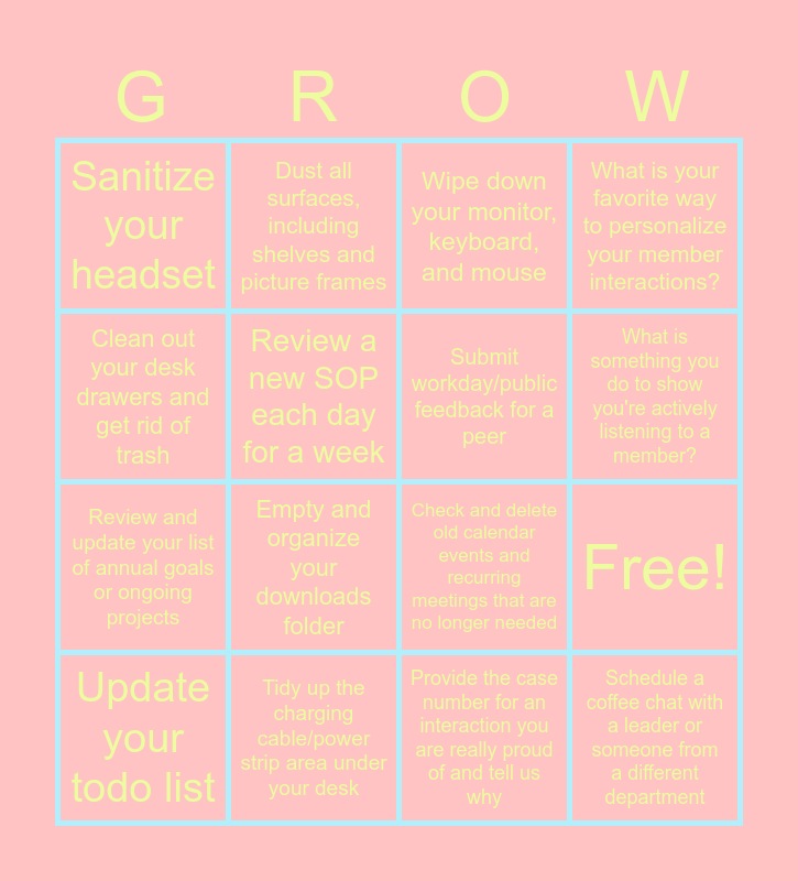 This bingo card has 20 words: Free!, Clean out your digital and physical desktop and organize files and bookmarks, Wipe down your monitor, keyboard, and mouse, Purge unnecessary emails and organize folders, Update your todo list, Clean out your desk drawers and get rid of trash, Tidy up the charging cable/power strip area under your desk, Sanitize your headset, Review and update your list of annual goals or ongoing projects, Dust all surfaces, including shelves and picture frames, Empty and organize your downloads folder, Check and delete old calendar events and recurring meetings that are no longer needed, Review a new SOP each day for a week, Schedule a coffee chat with a leader or someone from a different department, Submit workday/public feedback for a peer, Attend 1 ERG/community event, What is something you do to show you're actively listening to a member?, What is your favorite way to personalize your member interactions?, Provide the case number for an interaction you are really proud of and tell us why and Name a specialist that has helped you provide a better member experience and how.
