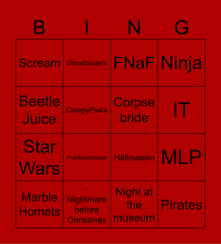 This bingo card has 16 words: - Nightmare before Christmas, MLP, FNaF, Scream, Star Wars, Ghostbusters, Halloween, Night at the museum, Beetle Juice, CreepyPasta, Marble Hornets, Ninja, Frankenweenie, IT, Corpse bride and Pirates.