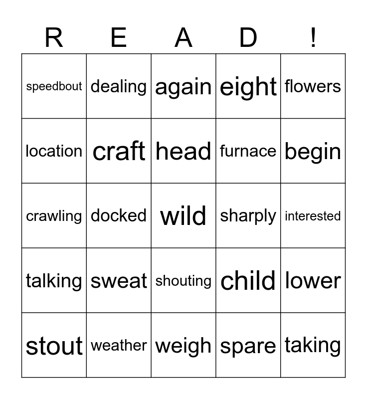 This bingo card has a free space and 24 words: sweat, weather, head, stout, flowers, speedbout, location, dealing, sharply, shouting, furnace, crawling, child, lower, craft, spare, interested, again, begin, docked, taking, talking, eight and weigh.
