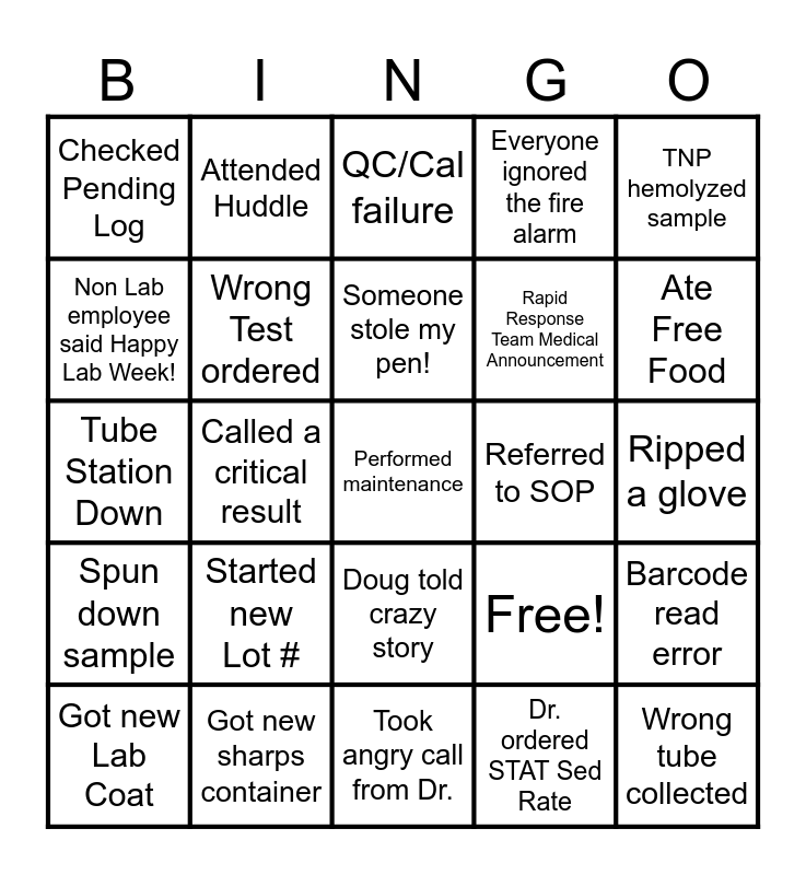 This bingo card has 25 words: Started new Lot #, Took angry call from Dr., Someone stole my pen!, Got new Lab Coat, TNP hemolyzed sample, Checked Pending Log, Non Lab employee said Happy Lab Week!, Attended Huddle, Referred to SOP, Doug told crazy story, Rapid Response Team Medical Announcement, Tube Station Down, Free!, Barcode read error, Wrong Test ordered, Wrong tube collected, Ripped a glove, QC/Cal failure, Ate Free Food, Called a critical result, Performed maintenance, Got new sharps container, Spun down sample, Everyone ignored the fire alarm and Dr. ordered STAT Sed Rate.