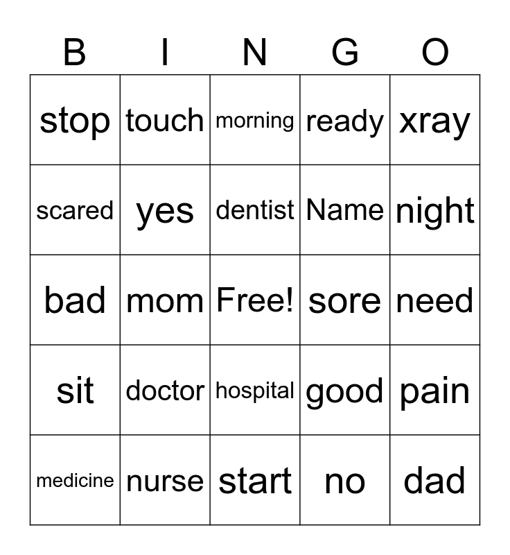 This bingo card has a free space and 24 words: doctor, nurse, dentist, medicine, xray, stop, scared, touch, sore, hospital, Name, bad, good, pain, yes, no, need, morning, night, mom, dad, sit, ready and start.