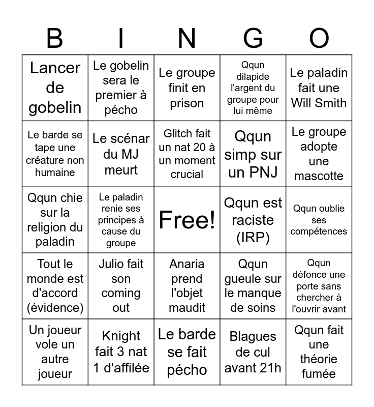 This bingo card has a free space and 24 words: Julio fait son coming out, Knight fait 3 nat 1 d'affilée, Glitch fait un nat 20 à un moment crucial, Un joueur vole un autre joueur, Le paladin fait une Will Smith, Lancer de gobelin, Le barde se tape une créature non humaine, Le gobelin sera le premier à pécho, Qqun est raciste (IRP), Anaria prend l'objet maudit, Qqun simp sur un PNJ, Qqun chie sur la religion du paladin, Qqun gueule sur le manque de soins, Qqun défonce une porte sans chercher à l'ouvrir avant, Le scénar du MJ meurt, Blagues de cul avant 21h, Qqun oublie ses compétences, Le groupe finit en prison, Le groupe adopte une mascotte, Le paladin renie ses principes à cause du groupe, Qqun fait une théorie fumée, Tout le monde est d'accord (évidence), Qqun dilapide l'argent du groupe pour lui même and Le barde se fait pécho.