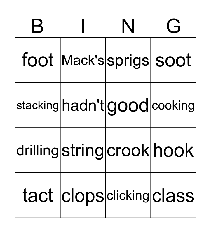 This bingo card has 16 words: clops, hook, sprigs, foot, drilling, Mack's, crook, clicking, stacking, hadn't, tact, soot, string, cooking, good and class.