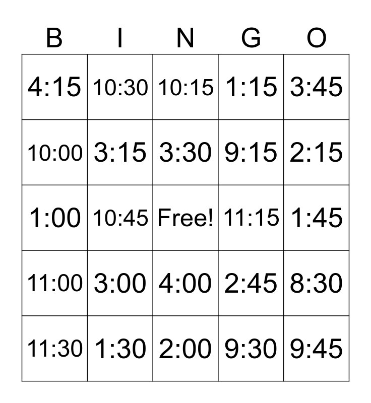 This bingo card has a free space and 28 words: 8:30, 9:00, 9:15, 9:30, 10:00, 10:15, 10:30, 11:00, 11:15, 11:30, 1:00, 1:15, 1:30, 2:00, 2:15, 2:30, 3:00, 3:15, 3:30, 4:00, 4:15, 8:45, 9:45, 10:45, 1:45, 2:45, 3:45 and 11:45.