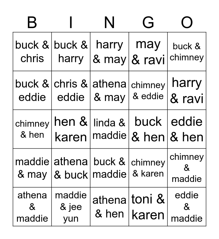 This bingo card has 25 words: athena & buck, athena & hen, athena & may, athena & maddie, buck & chimney, buck & chris, buck & eddie, buck & harry, buck & hen, buck & maddie, chimney & eddie, chimney & hen, chimney & karen, chimney & maddie, chris & eddie, eddie & maddie, eddie & hen, harry & may, harry & ravi, hen & karen, linda & maddie, maddie & jee yun, maddie & may, may & ravi and toni & karen.