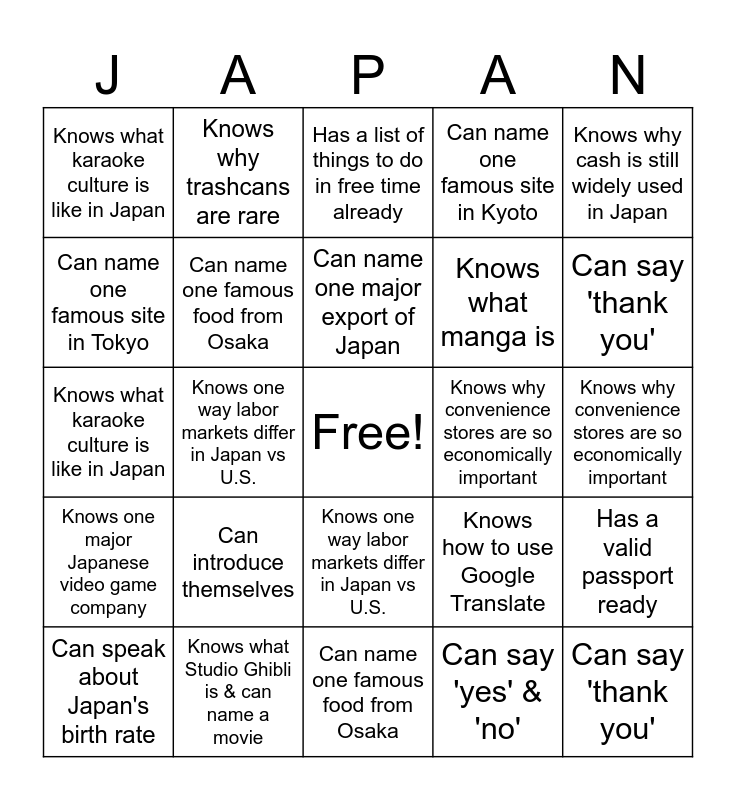 This bingo card has a free space and 53 words: Can say 'hello', Can say 'thank you', Can say 'excuse me/sorry', Can say 'yes' & 'no', Can introduce themselves, Can say 'please', Knows why trashcans are rare, Knows the significance of Hiroshima, Can name one famous site in Tokyo, Can name one famous site in Kyoto, Can name one famous food from Osaka, Has a list of things to do in free time already, Has a valid passport ready, Knows how to use Google Translate, Knows what 'lose decades" refers to, Can speak about Japan's birth rate, Can name one major export of Japan, Knows why convenience stores are so economically important, Knows how tourism impacts Japan’s economy, Knows why cash is still widely used in Japan, Knows one way labor markets differ in Japan vs U.S., Has watched anime before the trip, Knows what manga is, Knows what karaoke culture is like in Japan, Knows one major Japanese video game company, Knows what Studio Ghibli is & can name a movie, Knows what a vending machine culture looks like in Japan, Knows why Japan’s pop culture is globally influential, Can say 'hello', Can say 'thank you', Can say 'excuse me/sorry', Can introduce themselves, Can say 'please', Knows why trashcans are rare, Knows the significance of Hiroshima, Can name one famous site in Tokyo, Can name one famous site in Kyoto, Can name one famous food from Osaka, Has a list of things to do in free time already, Knows what 'lose decades" refers to, Can speak about Japan's birth rate, Can name one major export of Japan, Knows why convenience stores are so economically important, Knows how tourism impacts Japan’s economy, Knows why cash is still widely used in Japan, Knows one way labor markets differ in Japan vs U.S., Has watched anime before the trip, Knows what manga is, Knows what karaoke culture is like in Japan, Knows one major Japanese video game company, Knows what Studio Ghibli is & can name a movie, Knows what a vending machine culture looks like in Japan and Knows why Japan’s pop culture is globally influential.