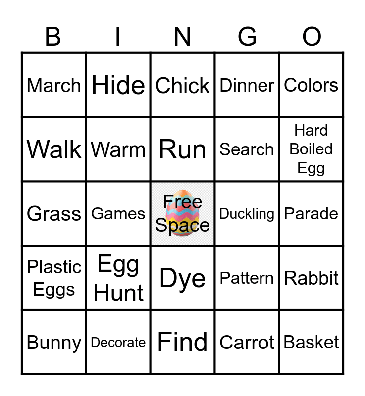 This bingo card has a free space and 45 words: April, Basket, Bouquet, Bunny, Candy, Carrot, Chick, Chocolate, Colors, Decorate, Dinner, Duckling, Dye, Egg Hunt, Egg, Find, Flowers, Grass, Ham, Hard Boiled Egg, Hide, Jelly Beans, Lillies, March, Nest, Parade, Party, Pastels, Pattern, Plastic Eggs, Confetti Eggs, Rabbit, Spring, Tulips, Marshmallow, Games, Family, Hop, Peeps, Run, Walk, Search, Lawn, Warm and Sweet.