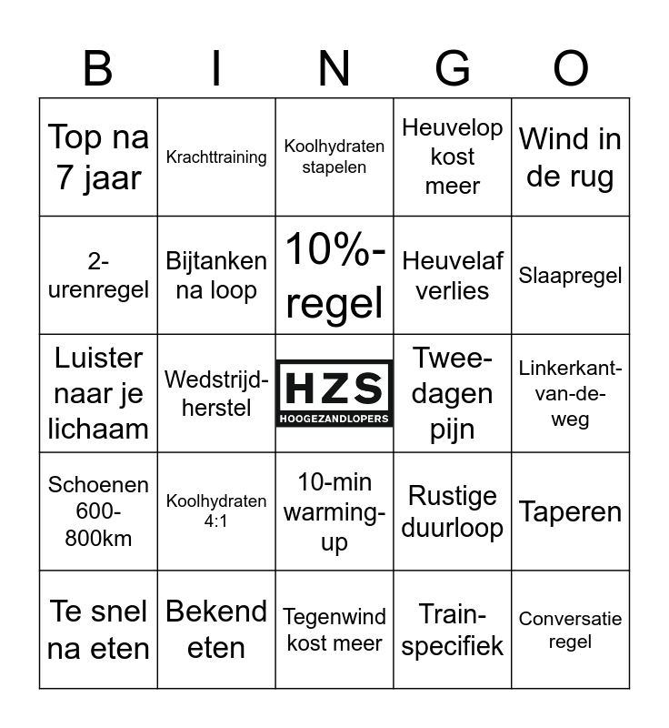 This bingo card has a free space and 24 words: Koolhydraten 4:1, Bekend eten, 10%-regel, Te snel na eten, Wind in de rug, Top na 7 jaar, 2-urenregel, Krachttraining, Twee-dagen pijn, 10-min warming-up, Heuvelaf verlies, Luister naar je lichaam, Rustige duurloop, Taperen, Bijtanken na loop, Train-specifiek, Linkerkant-van-de-weg, Koolhydraten stapelen, Slaapregel, Wedstrijd-herstel, Conversatie regel, Schoenen 600-800km, Heuvelop kost meer and Tegenwind kost meer.
