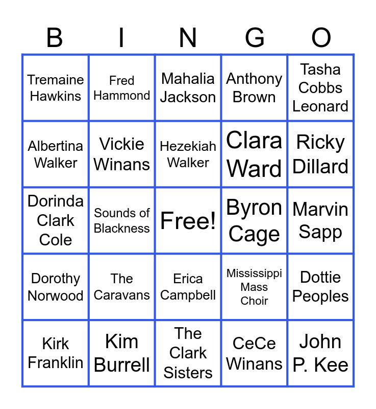 This bingo card has a free space and 44 words: Tamela Mann, John P. Kee, Yolanda Adams, Kirk Franklin, Shirley Caesar, CeCe Winans, Mahalia Jackson, Aretha Franklin, Tasha Cobbs Leonard, Kim Burrell, Anthony Brown, Byron Cage, Erica Campbell, The Caravans, Kurt Carr, The Clark Sisters, Rev. James Cleveland, Dorinda Clark Cole, Andrae Crouch, Ricky Dillard, Fred Hammond, Walter Hawkins, Deitrick Haddon, Tremaine Hawkins, Donald Lawrence, Marvin Sapp, Mary Mary, Donnie McClurkin, Mississippi Mass Choir, Dorothy Norwood, LaShun Pace, Dottie Peoples, Karen Clark Sheard, Kiera 'Kiki' Sheard, Sounds of Blackness, The Staple Singers, Take 6, Tye Tribbett, Hezekiah Walker, Albertina Walker, Clara Ward, The Winans, Vickie Winans and Bebe Winans.