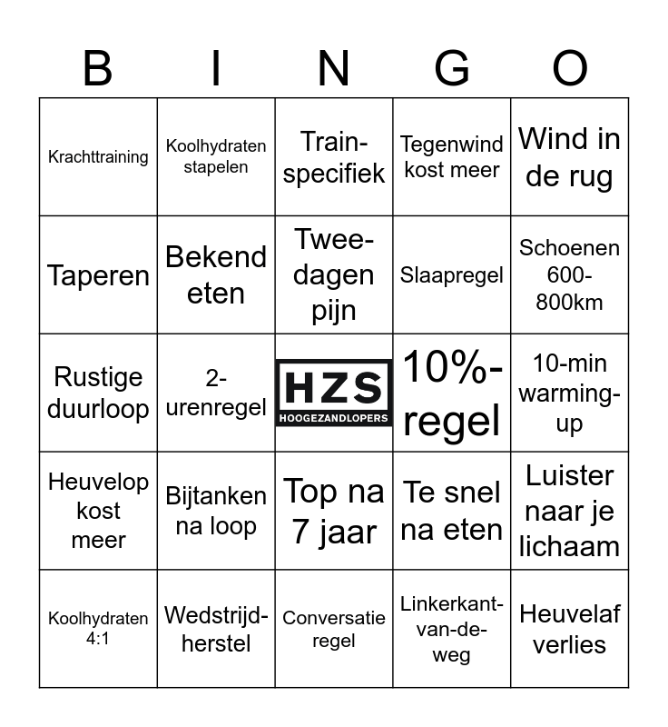This bingo card has a free space and 24 words: Bijtanken na loop, Wedstrijd-herstel, Twee-dagen pijn, Koolhydraten 4:1, Wind in de rug, Krachttraining, Taperen, Koolhydraten stapelen, 10%-regel, Top na 7 jaar, Slaapregel, Rustige duurloop, Te snel na eten, Luister naar je lichaam, Bekend eten, Linkerkant-van-de-weg, 10-min warming-up, Train-specifiek, Schoenen 600-800km, 2-urenregel, Heuvelaf verlies, Heuvelop kost meer, Tegenwind kost meer and Conversatie regel.