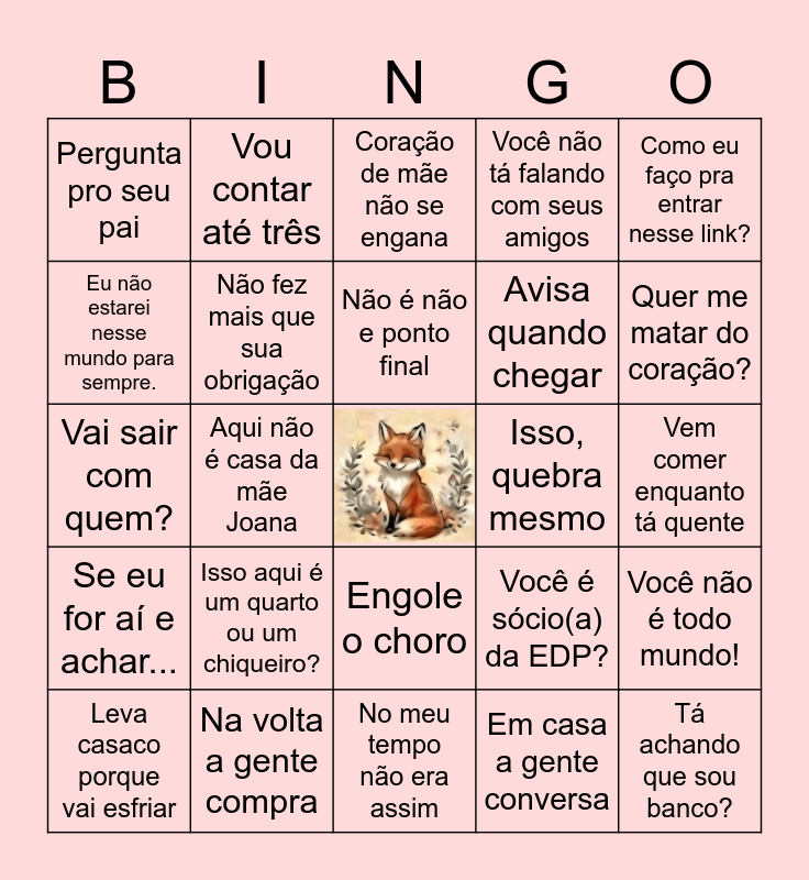 This bingo card has a free space and 32 words: Em casa a gente conversa, Me respeita que sou sua mãe, Aqui não é casa da mãe Joana, Um dia você vai me agradecer, Se eu for aí e achar..., Não fez mais que sua obrigação, Como eu faço pra entrar nesse link?, Você não é todo mundo!, Vou contar até três, Eu só quero o seu bem, Não é não e ponto final, Coração de mãe não se engana, O combinado não sai caro, Eu avisei não avisei?, Isso, quebra mesmo, Depois não adianta vir chorando, Leva casaco porque vai esfriar, Vai sair com quem?, Engole o choro, Isso aqui é um quarto ou um chiqueiro?, Você é sócio(a) da EDP?, Se sujar vai limpar, Vem comer enquanto tá quente, Na volta a gente compra, Tá achando que sou banco?, Você não tá falando com seus amigos, Avisa quando chegar, Eu não estarei nesse mundo para sempre., Pergunta pro seu pai, No meu tempo não era assim, Tudo eu nessa casa and Quer me matar do coração?.
