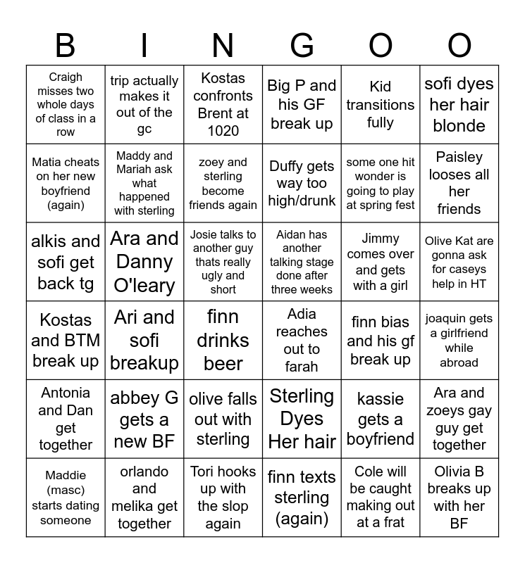 This bingo card has 36 words: Sterling Dyes Her hair, olive falls out with sterling, finn texts sterling (again), Matia cheats on her new boyfriend (again), Kostas and BTM break up, Aidan has another talking stage done after three weeks, Maddy and Mariah ask what happened with sterling, Tori hooks up with the slop again, Kid transitions fully, kassie gets a boyfriend, Paisley looses all her friends, Big P and his GF break up, Ara and zoeys gay guy get together, Ara and Danny O'leary, Duffy gets way too high/drunk, Craigh misses two whole days of class in a row, Antonia and Dan get together, Jimmy comes over and gets with a girl, alkis and sofi get back tg, Kostas confronts Brent at 1020, Josie talks to another guy thats really ugly and short, Ari and sofi breakup, Adia reaches out to farah, finn drinks beer, finn bias and his gf break up, trip actually makes it out of the gc, some one hit wonder is going to play at spring fest, orlando and melika get together, zoey and sterling become friends again, sofi dyes her hair blonde, Olivia B breaks up with her BF, Maddie (masc) starts dating someone, joaquin gets a girlfriend while abroad, Olive Kat are gonna ask for caseys help in HT, abbey G gets a new BF and Cole will be caught making out at a frat.