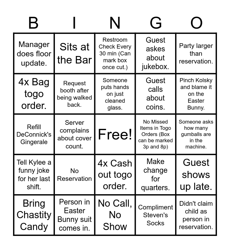 This bingo card has a free space and 24 words: No Reservation, Person in Easter Bunny suit comes in., Someone puts hands on just cleaned glass., Bring Chastity Candy, Party larger than reservation., Manager does floor update., 4x Bag togo order., Sits at the Bar, No Missed Items in Togo Orders (Box can be marked 3p and 8p), 4x Cash out togo order., Guest calls about coins., Refill DeConnick's Gingerale, Make change for quarters., Guest shows up late., Request booth after being walked back., Compliment Steven's Socks, Someone asks how many gumballs are in the machine., Restroom Check Every 30 min (Can mark box once cut.), Pinch Kolsky and blame it on the Easter Bunny., Server complains about cover count., Didn't claim child as person in reservation., Tell Kylee a funny joke for her last shift., Guest askes about jukebox. and No Call, No Show.