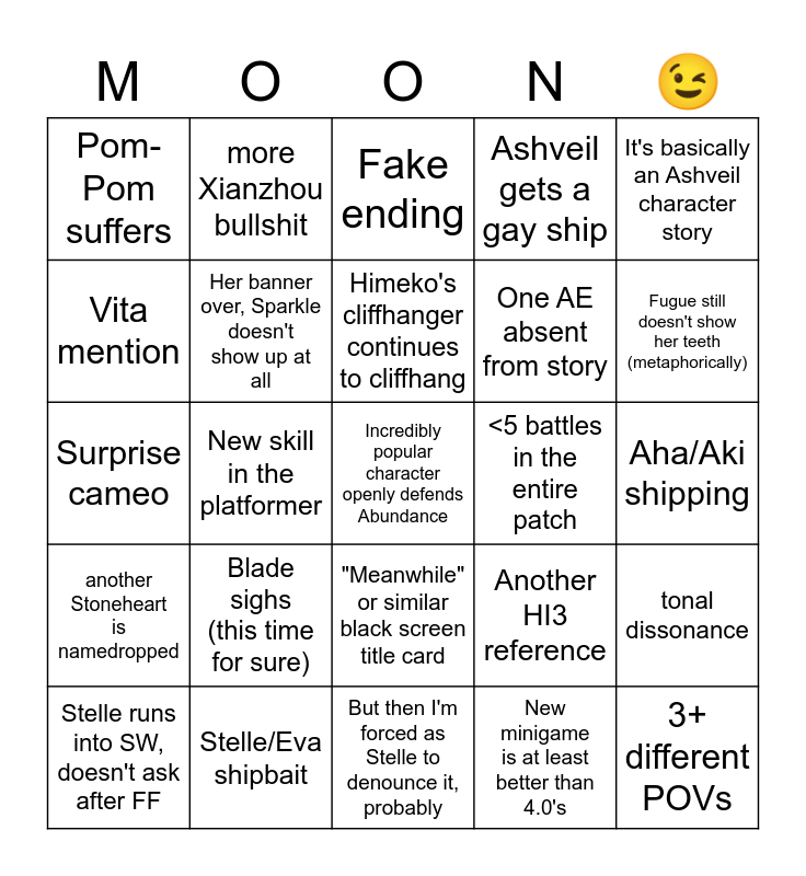 This bingo card has a free space and 24 words: Stelle runs into SW, doesn't ask after FF, Blade sighs (this time for sure), Himeko's cliffhanger continues to cliffhang, New minigame is at least better than 4.0's, It's basically an Ashveil character story, Pom-Pom suffers, more Xianzhou bullshit, Fake ending, <5 battles in the entire patch, Aha/Aki shipping, Surprise cameo, Her banner over, Sparkle doesn't show up at all, Another HI3 reference, tonal dissonance, Vita mention, Stelle/Eva shipbait, But then I'm forced as Stelle to denounce it, probably, Ashveil gets a gay ship, Fugue still doesn't show her teeth (metaphorically), another Stoneheart is namedropped, New skill in the platformer, "Meanwhile" or similar black screen title card, One AE absent from story and 3+ different POVs.