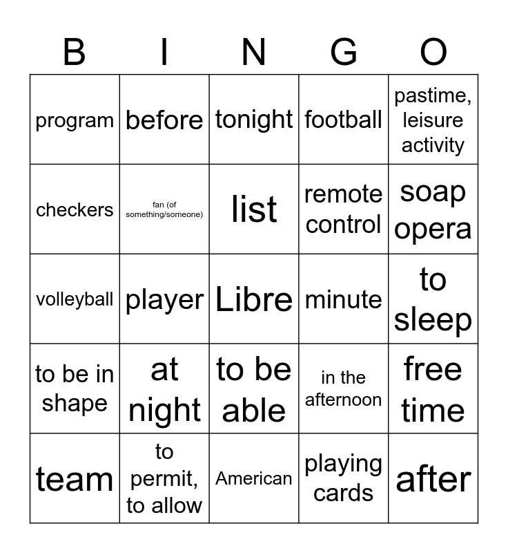 This bingo card has a free space and 48 words: aerobics, after, almost, American, at night, basketball, before, chess, checkers, century, fan (of something/someone), football, free time, in the afternoon, in the morning, life, list, minute, okay, pastime, leisure activity, player, playing cards, program, remote control, same, soap opera, team, television set, to be able, to be in shape, to cost, to draw, to sketch, to give, to lose, to permit, to allow, to remember, to rent, to sleep, to tie (sports), to turn off, to win, to return, to go back, to come back, tonight, video game, volleyball, wonderful, marvelous, yet, still and right now.
