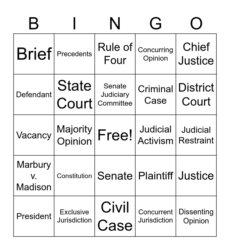 This bingo card has a free space and 39 words: The Judiciary, Supreme Court, Federal Court, State Court, President, Senate, Senate Judiciary Committee, Quorum, Chief Justice, Marbury v. Madison, Majority Opinion, Concurring Opinion, Dissenting Opinion, Judicial Restraint, Judicial Activism, Constitution, Conference, Brief, Oral Argument, Plaintiff, Defendant, Civil Case, Criminal Case, District Court, Circuit Court, Jurisdiction, Original Jurisdiction, Appellate Jurisdiction, Impeach, Precedents, State Court, Writ of Certiorari, Rule of Four, Exclusive Jurisdiction, Concurrent Jurisdiction, Chief Justice John Marshall, Justice, Vacancy and Jurisprudence.