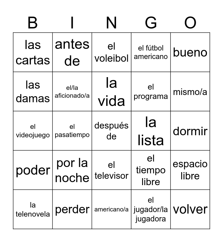 This bingo card has 49 words: los aeróbicos, después de, casi, americano/a, por la noche, el básquetbol, antes de, el ajedrez, las damas, el siglo, el/la aficionado/a, el fútbol americano, espacio libre, el tiempo libre, por la tarde, por la mañana, la vida, la lista, el minuto, bueno, el pasatiempo, el jugador/la jugadora, las cartas, el programa, el control remoto, mismo/a, la telenovela, el equipo, el televisor, poder, estar en forma, costar, dibujar, dar, perder, permitir, recordar, alquilar, dormir, empatar, apagar, ganar, volver, esta noche, el videojuego, el voleibol, estupendo/a, todavía and ahora mismo.