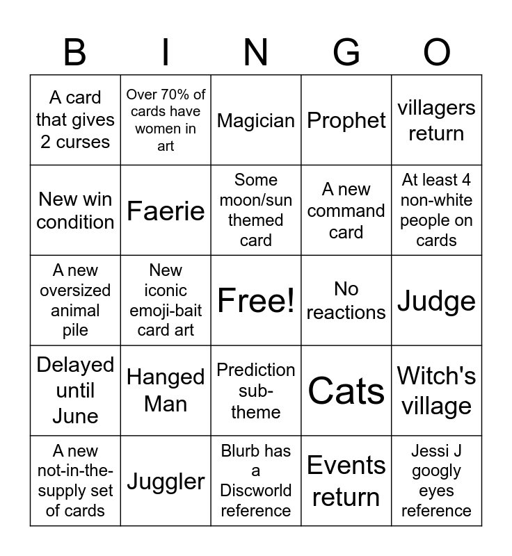 This bingo card has a free space and 24 words: Hanged Man, Juggler, Some moon/sun themed card, A new not-in-the-supply set of cards, villagers return, A card that gives 2 curses, New win condition, Over 70% of cards have women in art, No reactions, Prediction sub-theme, A new command card, A new oversized animal pile, Cats, Witch's village, Faerie, Events return, Judge, Magician, At least 4 non-white people on cards, New iconic emoji-bait card art, Jessi J googly eyes reference, Delayed until June, Prophet and Blurb has a Discworld reference.