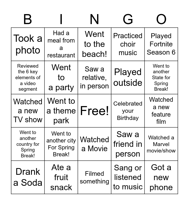 This bingo card has a free space and 24 words: Went to another city For Spring Break!, Ate a fruit snack, Saw a relative, in person, Drank a Soda, Played Fortnite Season 6, Took a photo, Reviewed the 6 key elements of a video segment, Had a meal from a restaurant, Celebrated your Birthday, Watched a Movie, Played outside, Watched a new TV show, Saw a friend in person, Watched a Marvel movie/show, Went to a party, Sang or listened to music, Watched a new feature film, Went to the beach!, Went to another State for Spring Break!, Went to a theme park, Got a new phone, Went to another country for Spring Break!, Practiced choir music and Filmed something.