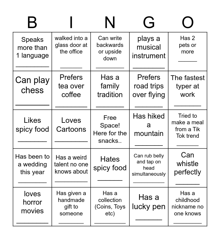 This bingo card has a free space and 24 words: Has a weird talent no one knows about __________, Has given a handmade gift to someone ________, Has a family tradition _______, loves horror movies ________, Has 2 pets or more ______, Speaks more than 1 language _________, Can play chess _______, walked into a glass door at the office _______, Has hiked a mountain _______, Hates spicy food ______, Prefers road trips over flying _______, Likes spicy food _______, Can rub belly and tap on head simultaneously ___________, Can whistle perfectly ______, Prefers tea over coffee ________, Has a lucky pen ______, Tried to make a meal from a Tik Tok trend _______, Can write backwards or upside down _________, The fastest typer at work _______, Loves Cartoons ________, Has a childhood nickname no one knows _________, Has been to a wedding this year ________, plays a musical instrument ________ and Has a collection (Coins, Toys etc) __________.