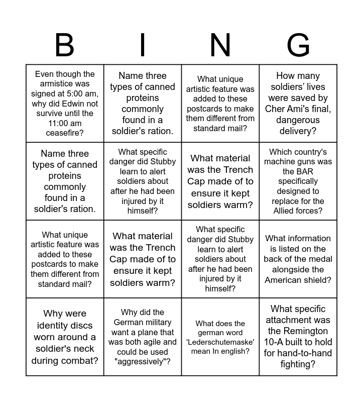 This bingo card has 37 words: Free!, Why did the German military want a plane that was both agile and could be used "aggressively"?, Even though the armistice was signed at 5:00 am, why did Edwin not survive until the 11:00 am ceasefire?, What material was the Trench Cap made of to ensure it kept soldiers warm?, What was the primary and most dangerous use for the L30 Zeppelin during WWI?, Who was the inventor responsible for designing this steel helmet in 1915?, Which country's machine guns was the BAR specifically designed to replace for the Allied forces?, The Mk 1 marked a change from "improvised" explosives to what kind of reliable weapons?, Name three types of canned proteins commonly found in a soldier's ration., How many rounds are in the magazine of the WW1 rifle, What information is listed on the back of the medal alongside the American shield?, How many soldiers’ lives were saved by Cher Ami's final, dangerous delivery?, Why were identity discs worn around a soldier's neck during combat?, What does the german word 'Lederschutemaske' mean In english?, What specific danger did Stubby learn to alert soldiers about after he had been injured by it himself?, What specific attachment was the Remington 10-A built to hold for hand-to-hand fighting?, Which medal is considered the highest award for valour within the British Military?, What unique artistic feature was added to these postcards to make them different from standard mail?, Name two types of duties or uniforms where a commissioned officer would be required to wear this hat., Why did the German military want a plane that was both agile and could be used "aggressively"?, Even though the armistice was signed at 5:00 am, why did Edwin not survive until the 11:00 am ceasefire?, What material was the Trench Cap made of to ensure it kept soldiers warm?, What was the primary and most dangerous use for the L30 Zeppelin during WWI?, Who was the inventor responsible for designing this steel helmet in 1915?, Which country's machine guns was the BAR specifically designed to replace for the Allied forces?, The Mk 1 marked a change from "improvised" explosives to what kind of reliable weapons?, Name three types of canned proteins commonly found in a soldier's ration., How many rounds are in the magazine of the WW1 rifle, What information is listed on the back of the medal alongside the American shield?, How many soldiers’ lives were saved by Cher Ami's final, dangerous delivery?, Why were identity discs worn around a soldier's neck during combat?, What does the german word 'Lederschutemaske' mean In english?, What specific danger did Stubby learn to alert soldiers about after he had been injured by it himself?, What specific attachment was the Remington 10-A built to hold for hand-to-hand fighting?, Which medal is considered the highest award for valour within the British Military?, What unique artistic feature was added to these postcards to make them different from standard mail? and Name two types of duties or uniforms where a commissioned officer would be required to wear this hat..