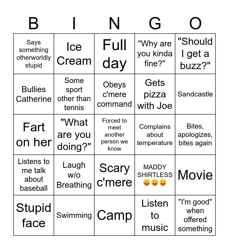 This bingo card has 25 words: Laugh w/o Breathing, Camp, Obeys c'mere command, Stupid face, "Should I get a buzz?", Says something otherworldly stupid, Bullies Catherine, Ice Cream, Complains about temperature, Scary c'mere, Gets pizza with Joe, Fart on her, MADDY SHIRTLESS 😛😛😛, Movie, Some sport other than tennis, "I'm good" when offered something, Bites, apologizes, bites again, Full day, Sandcastle, "What are you doing?", Forced to meet another person we know, Swimming, Listens to me talk about baseball, "Why are you kinda fine?" and Listen to music.