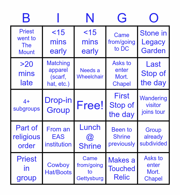 This bingo card has a free space and 24 words: From an EAS institution, Cowboy Hat/Boots, Needs a Wheelchair, Priest in group, Stone in Legacy Garden, Priest went to The Mount, >20 mins late, <15 mins early, First Stop of the day, Lunch @ Shrine, Asks to enter Mort. Chapel, 4+ subgroups, Been to Shrine previously, Group already subdivided, Matching apparel (scarf, hat, etc.), Makes a Touched Relic, Wandering visitor joins tour, <15 mins early, Last Stop of the day, Drop-in Group, Asks to enter Mort. Chapel, Part of religious order, Came from/going to DC and Came from/going to Gettysburg.