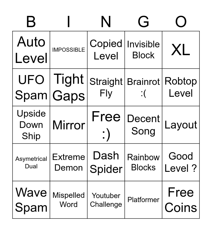 This bingo card has a free space and 24 words: Wave Spam, Extreme Demon, Straight Fly, Platformer, XL, Auto Level, IMPOSSIBLE, Copied Level, Decent Song, Layout, Upside Down Ship, Tight Gaps, Rainbow Blocks, Good Level ?, UFO Spam, Mispelled Word, Youtuber Challenge, Invisible Block, Robtop Level, Asymetrical Dual, Mirror, Dash Spider, Brainrot :( and Free Coins.