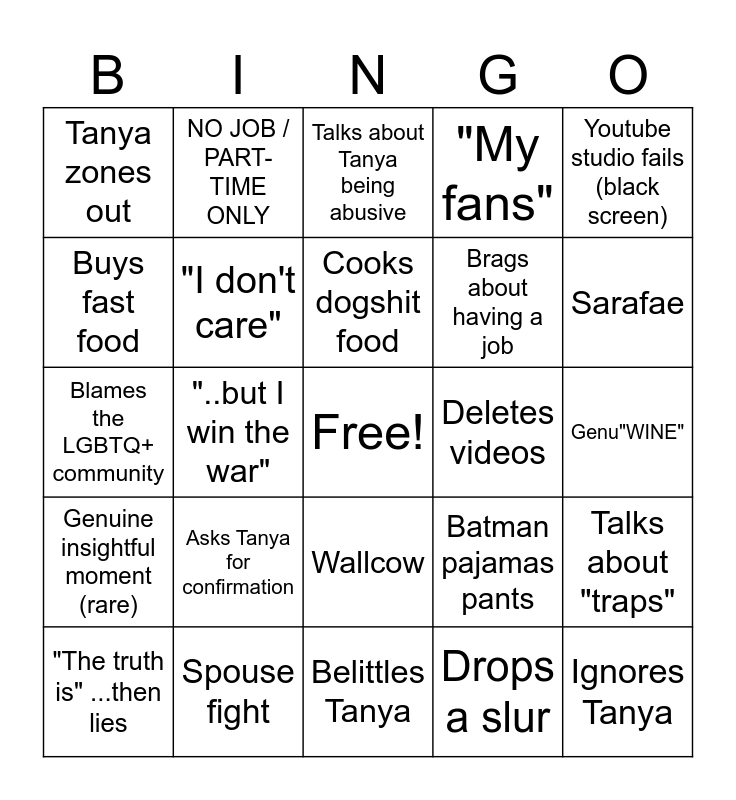 This bingo card has a free space and 29 words: "The truth is" ...then lies, "Looser", "..but I win the war", Music is too loud, Tanya zones out, Talks about Tanya being abusive, "I don't care", Asks Tanya for confirmation, Deletes videos, Spouse fight, Genu"WINE", Ignores Tanya, Belittles Tanya, Drops a slur, Sarafae, "I am doing something new", Wallcow, Genuine insightful moment (rare), Youtube studio fails (black screen), Blames the LGBTQ+ community, Batman pajamas pants, Clothes are too tight, Brags about having a job, Buys fast food, "My fans", NO JOB / PART-TIME ONLY, Talks about "traps", Cooks dogshit food and *cries*.